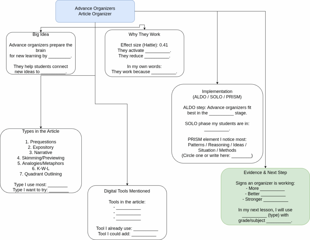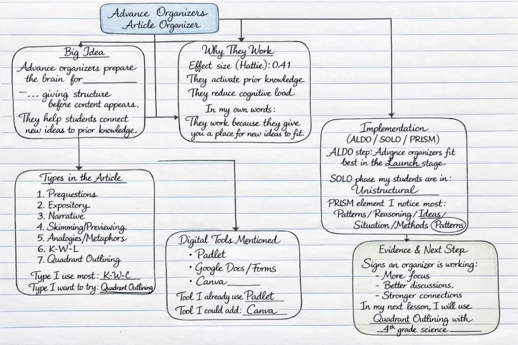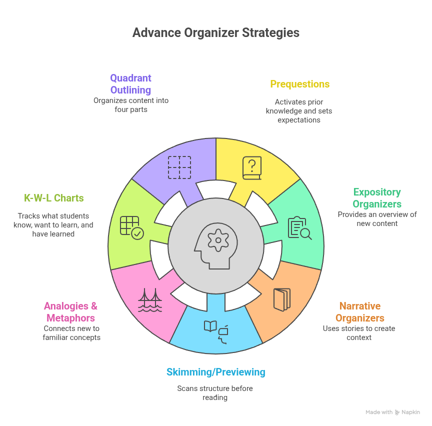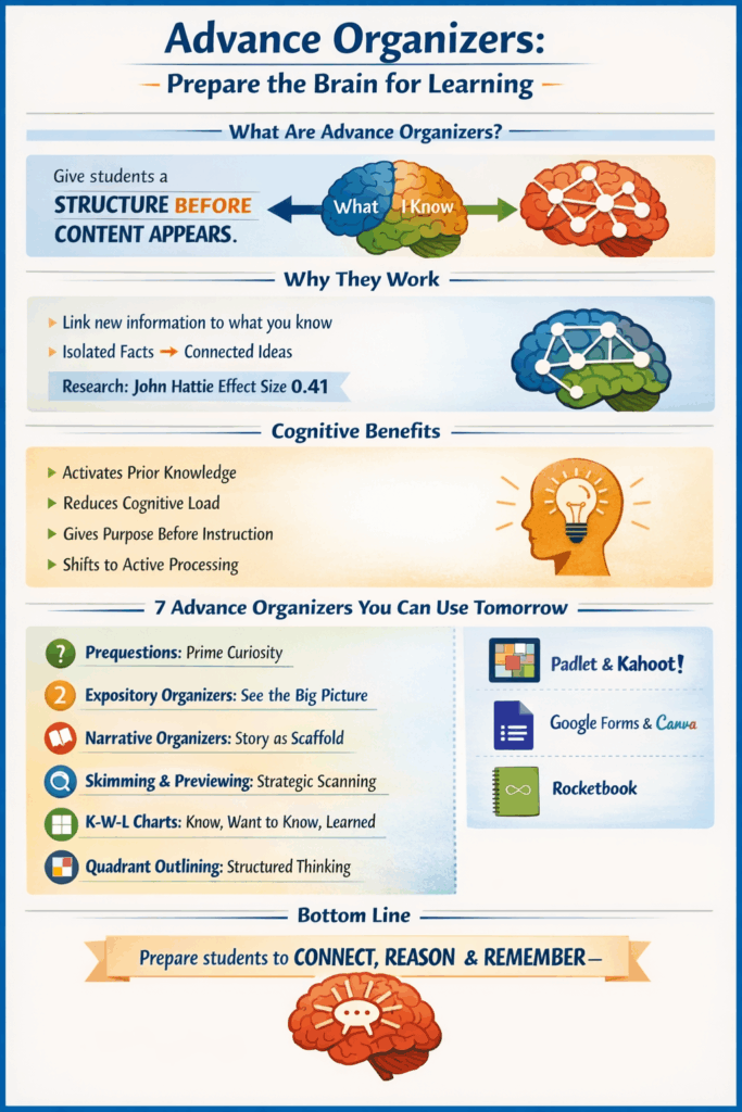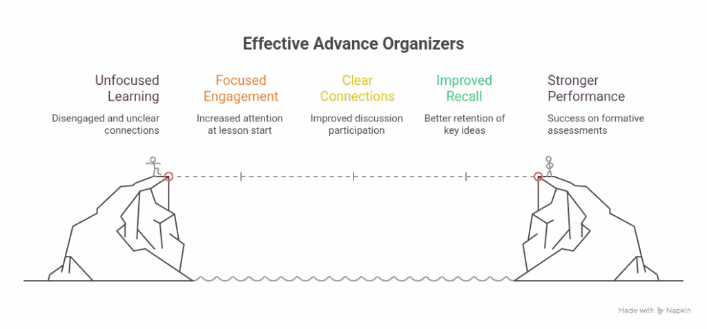 Advance organizers prepare the brain for new learning. They give students a structure before content appears. This simple shift can transform how learners encode and retrieve information. Instead of treating new material as isolated facts, students slot ideas into existing frameworks. The result is deeper learning with less cognitive strain.