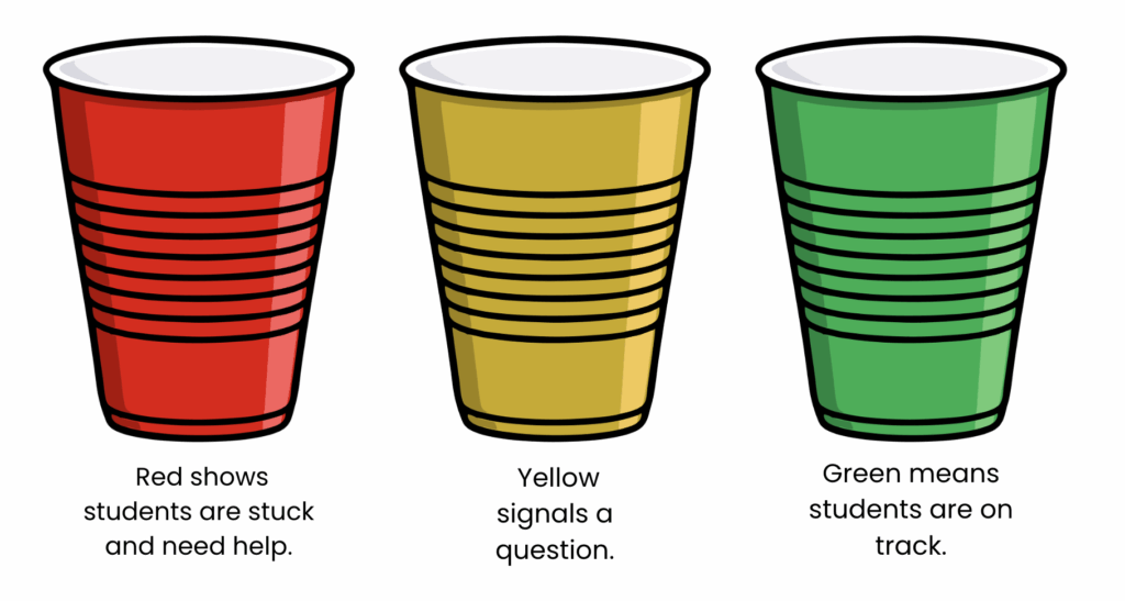 Teachers also use colored cups as simple classroom management signals. Students or groups place a cup on their table to show how they are doing during independent or group work. Green means they are on track, yellow signals a question, and red shows they are stuck and need help. This lets teachers scan the room quickly and prioritize support without interrupting learning.
