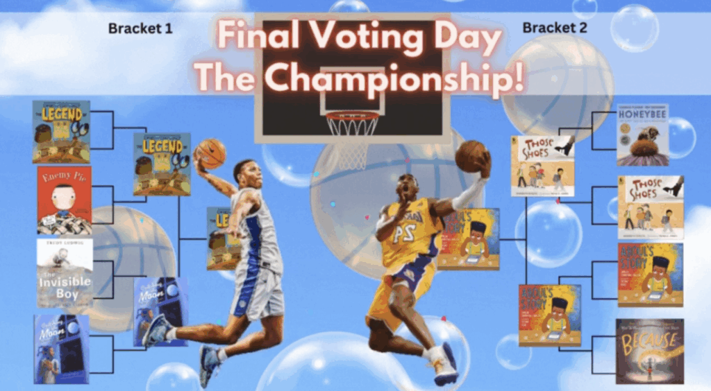 Librarians, teachers, instructional coaches, technology specialists, and even admin and office staff all collaborate to make this challenge a memorable event for students. Our librarian and technology specialist create the digital brackets and book jackets that will be displayed, as well as count the votes and send the digital link to teachers daily. Teachers & instructional coaches help to nominate books (pre-challenge) and collect votes (during the challenge), talk about the books with students, and the office shares the challenge each day with families on our school’s communication app.