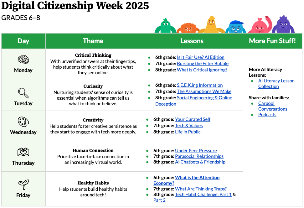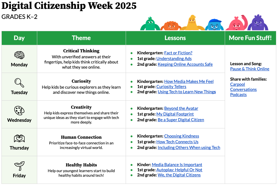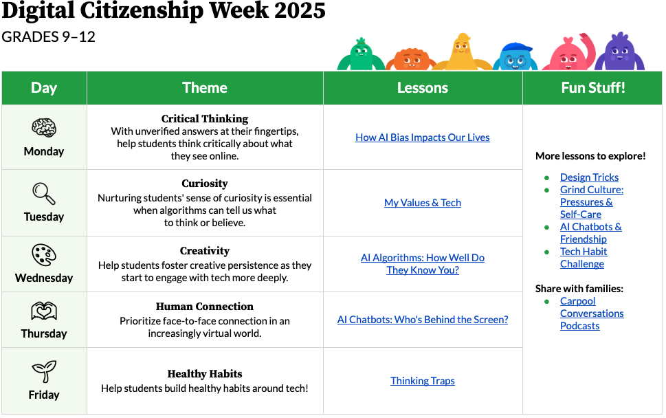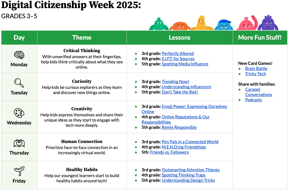 This year we’ve got brand-new resources to support students’ digital well-being in the age of AI. See below for our calendars full of suggested activities for each grade level, K–12, as well as events, free PD courses, a fun social media challenge, and more!