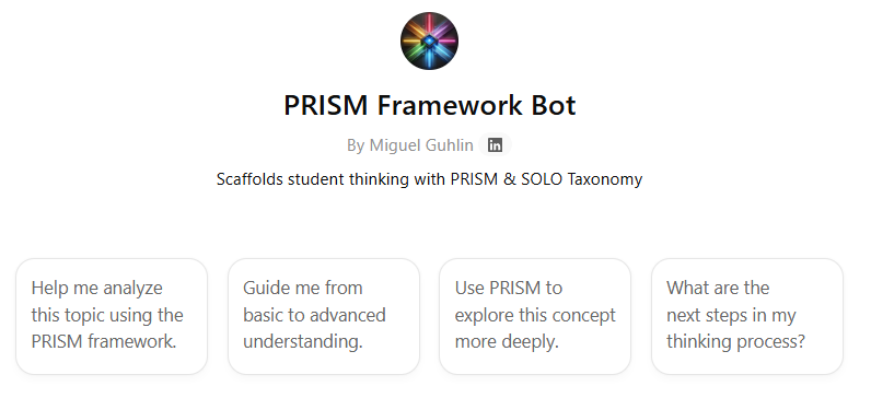 As an educator, you know firsthand how hard it is to get students to move beyond surface-level understanding. The PRISM Framework Bot (used under your guidance with students) addresses this challenge by structuring thinking across five areas: