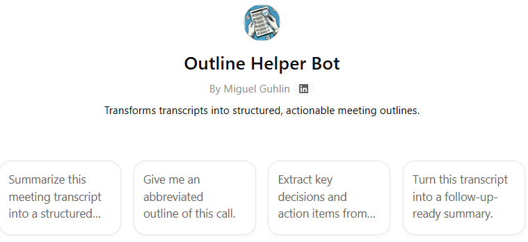 This is a custom GPT I use several times a week. How many meetings have you left wondering, “What did we actually decide?” The Outline Helper Bot transforms chaotic meeting transcripts into clear, hierarchical summaries that drive action and accountability. I often audio record meetings, then run the transcript through the Outline Helper Bot.