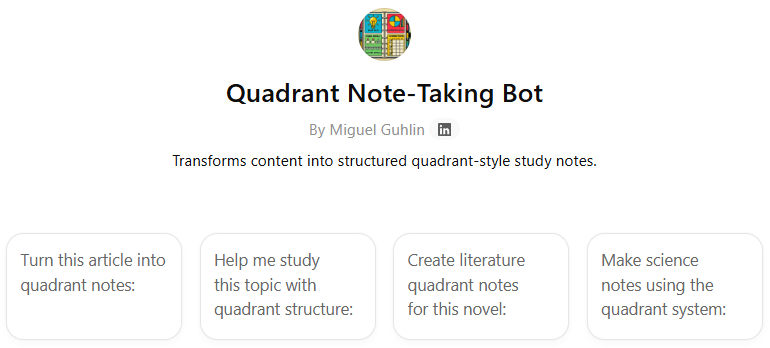Remember teaching Cornell Notes? The Quadrant Note-Taking Bot takes structured note-taking to the next level by guiding students to organize information into four strategic sections: