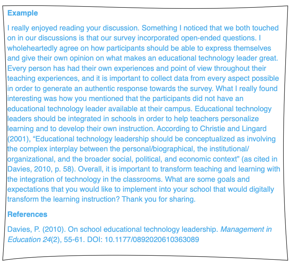 - Question – The question portion of your response, circles back to continue the dialogue with your peer. You would ask a question in relation to the post holistically or a portion of post. The question can be a follow up question to ask for more detail about a process or event, request more information about something, ask their opinions, or ask about their experience.