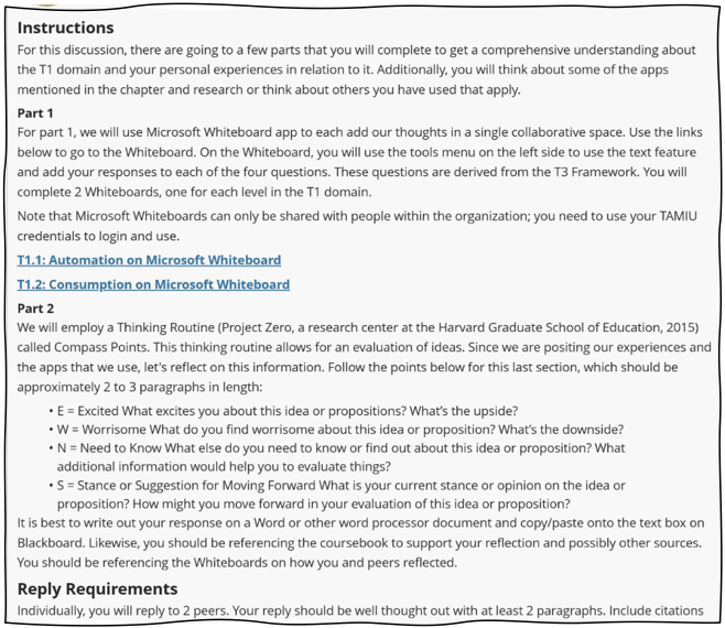 In the discussion forum instructions, they first needed to form groups by joining a buzz group of their choice based on the topic. Then, the group scheduled to meet and discuss the topic.