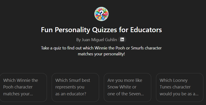 The big benefit of all this is that we not only end up with a fun personality quiz, but also, have a process for vibe coding our way from a custom GPT to a website hosted for free online. Of course, GitHub Pages may be blocked by your school district, but that’s another blog entry.