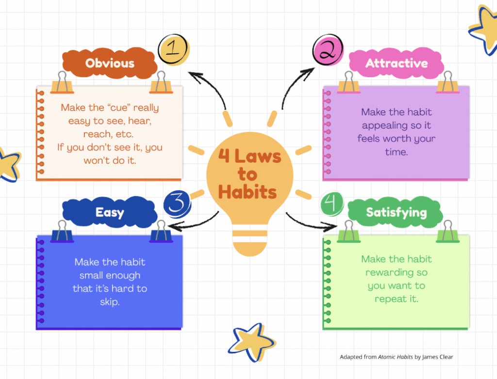 For teachers, this might look like moving away from “I want to be better at classroom management” and toward “I am the kind of teacher who clearly teaches expectations and reinforces them daily.” For students, it’s the difference between “I want better grades” and “I am a student who checks my understanding before turning in work.” Clear mentions that there are 4 laws to make a habit stick.