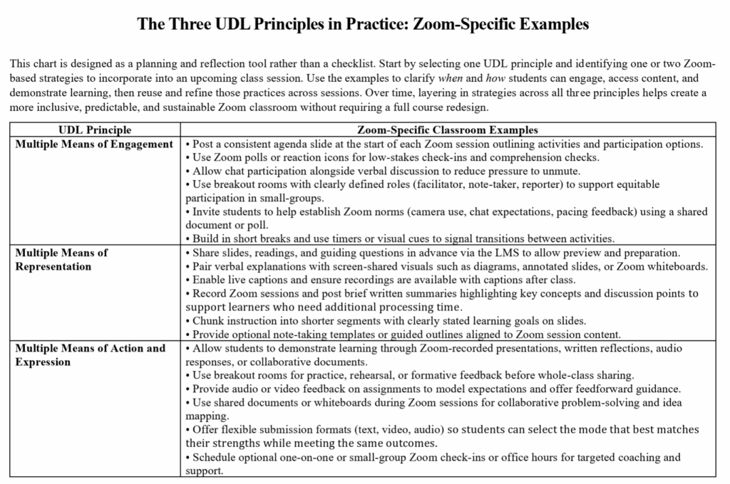Implementing UDL in Zoom does not require redesigning an entire course at once. The framework is intentionally flexible and scalable and small, strategic changes can have a meaningful impact.