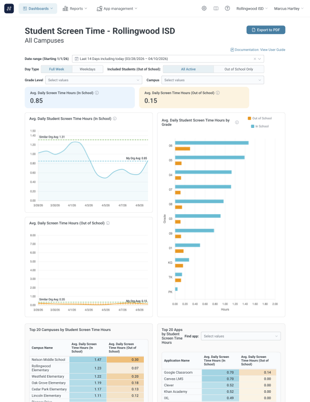 - Break down activity by grade, school, app and more